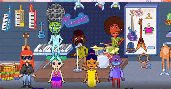 4、看到截图里这个乐器店没?里面的乐器都能拖出来让你的人物“试用”一下,叮叮当当还挺好玩。
