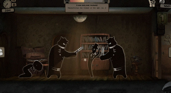 在这个游戏里, 你要面对的道德选择可不止一两次, 天平两边通常放着你的“家人”和那些“房客”。你可以当个彻头彻尾的混蛋, 为了给女儿治病, 不断敲诈、偷窃房客的东西, 等他们没利用价值了, 再抓住个把柄把人送进大牢, 然后名正言顺地把他们剩下的家当全吞了。可你要是想当个“好人”, 那对不起, 你的家人很可能就因为你这无聊的善良而死掉, 最后落得个妻离子散的结局, 后悔一辈子去吧。