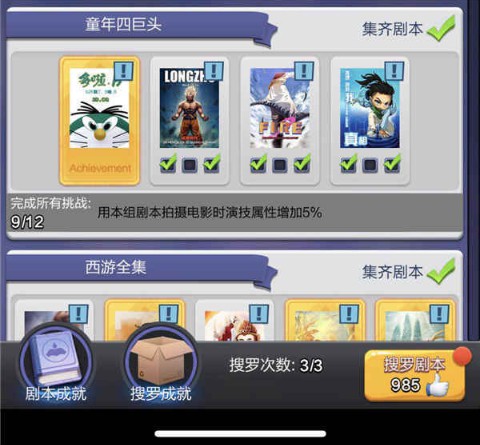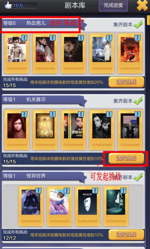 瞅瞅上面这张截图, 你得先把一整排的剧本都拿到手, 而且还得全部完成“镀金”, 之后才能开启这排剧本的挑战。关键在于, 挑战成功后的加成效果, 是对这一整排所有剧本都生效的, 这点很关键。每挑战成功一次, 原本的拍摄属性加成就给你提1%, 等级也跟着升1级, 后面等级高了加成可能会变。
