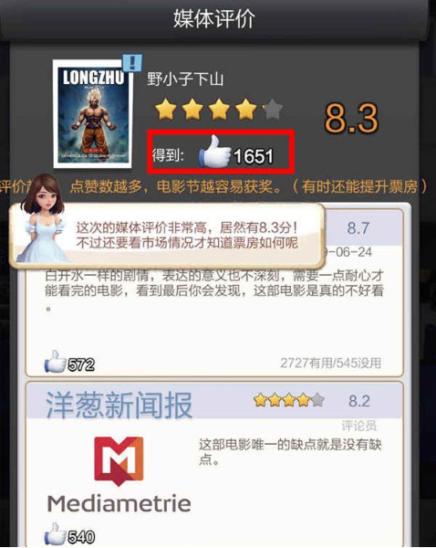 每拍完一部电影, 等媒体那边评价出来之后, 系统都会固定给你发一笔点赞数作为奖励。