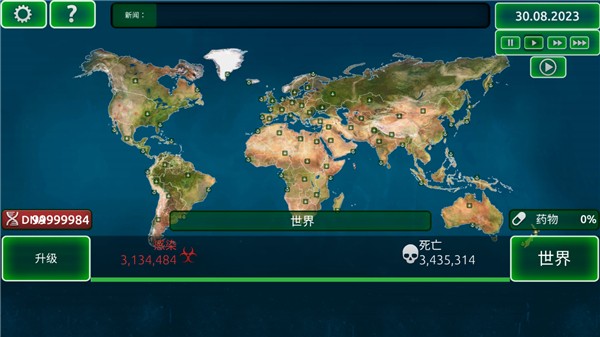 4、看到截图里这个界面没,这里能暂停也能快进,方便你布局。然后挑个国家,开始你的第一波感染。