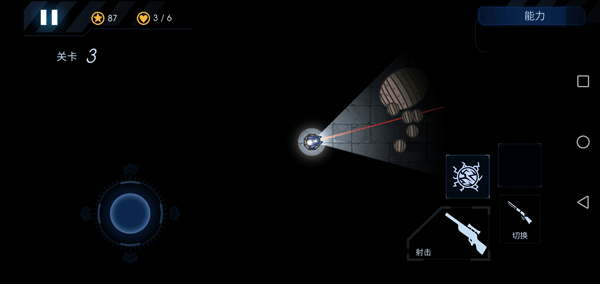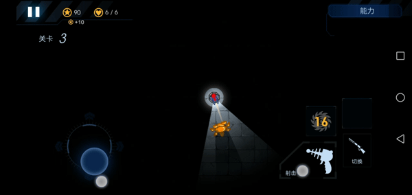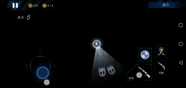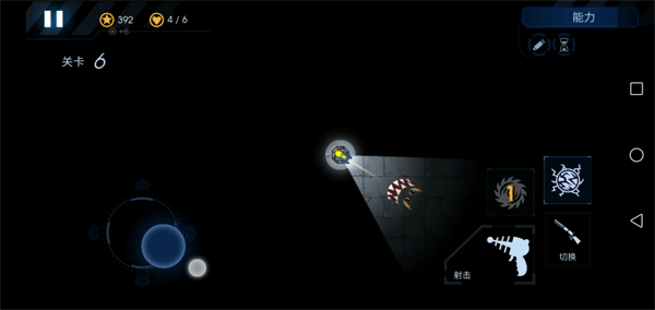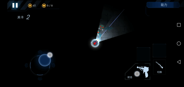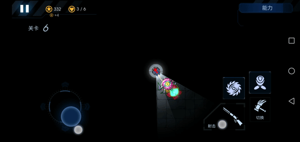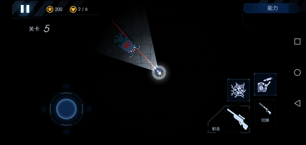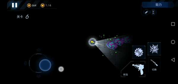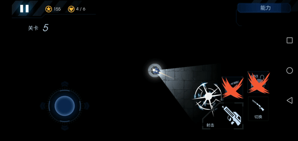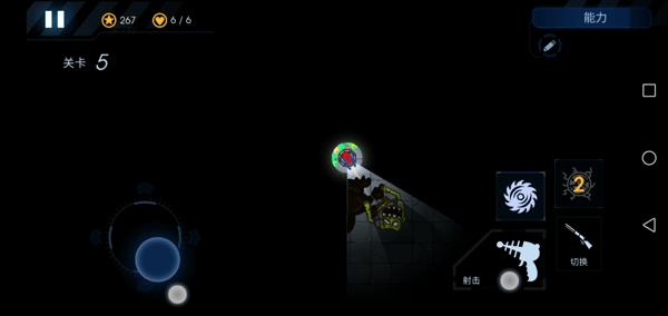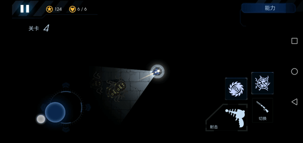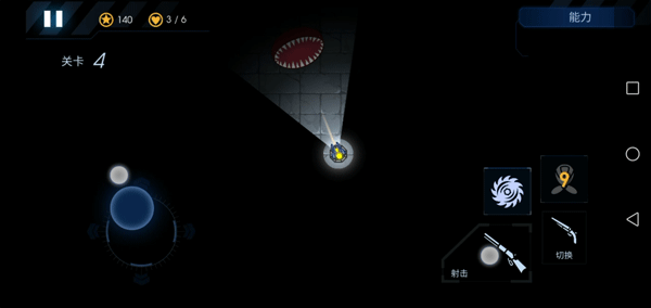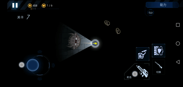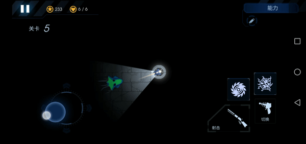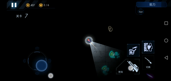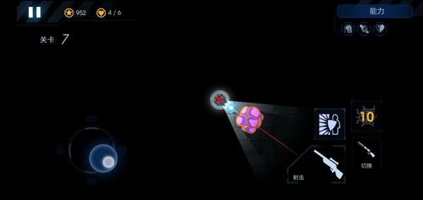 7、屏幕左边控制炮台的射击方向和照明区域,右边是开火、切换武器和放技能的按钮。