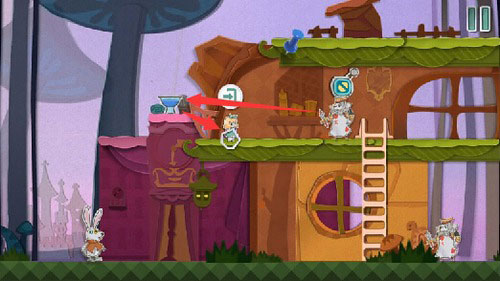 8、把黄色场景往右拖,让变小药水和变大蛋糕的瓶子叠在一起。用钥匙开门后,那个扑克兵会自己跑去喝变小药水,然后变得特别小。