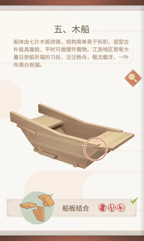 3、益智轻松的游戏玩法,了解榫卯的信息,获取最新的木头进行联合。