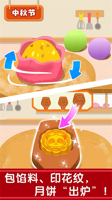 奇妙传统节日游戏在“中秋节”模块中,宝宝不仅可以学会制作节日美食:红豆沙传统月饼、奶黄冰皮月饼等,还可以和奇奇妙妙一起DIY花灯、赏圆月,过一个仪式感满满的中秋节!“八月十五中秋节,月儿圆圆挂天边。吃月饼、赏花灯,家家户户庆团圆……”
