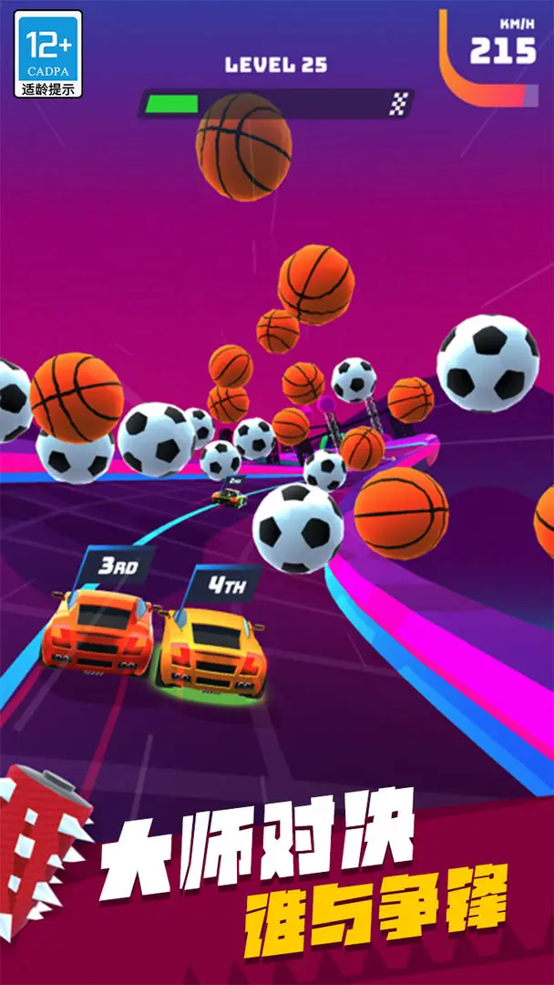 1、左右滑动屏幕控制赛车变道,及时躲避障碍物与对手车辆,保持高速前进。