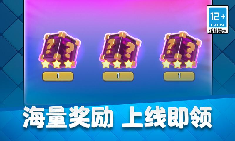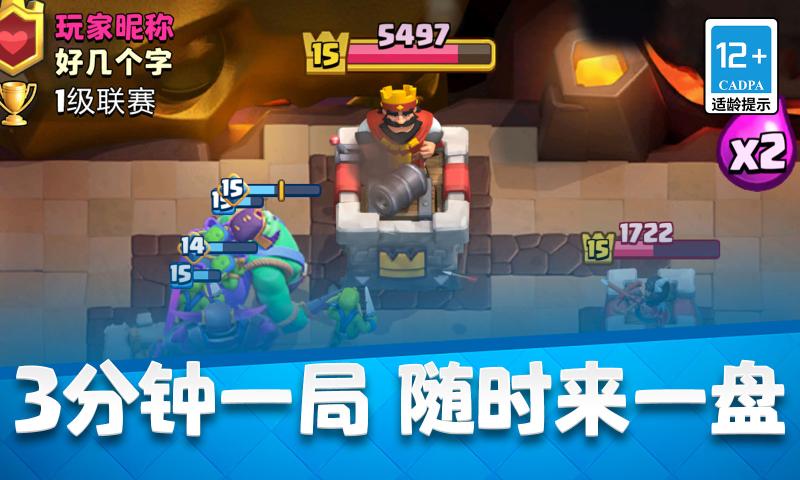 2、三分钟公平对决,实时激战与各地的玩家,随时开启一场酣畅淋漓的爽快对决,摧毁对方国王塔,赢取宝箱解锁奖励,并在排行里夺得荣耀!