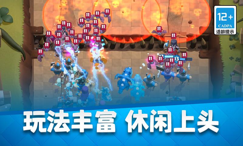 1、多种强力卡牌,玩转深度策略 不管是悠态可掬的飞龙宝宝、英气逼人的王子,轰翻全场的闪电、火球,还是各具特色的军营建筑,都将由你一手掌控。精心设计您的战斗牌组,凭借绝佳的策略和操作,击败对手,获取奖杯!