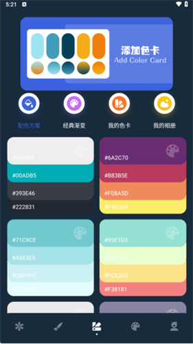 4、紧挨着填色区的是“添加色卡”板块。这个区域更偏向于专业的色彩搭配。无论你是想寻找现成的配色方案,还是想欣赏经典的渐变色彩,这里都能满足你。当然,你也可以在这里创建和管理属于你自己的专属色卡库,把每一个心动的颜色都收藏起来。